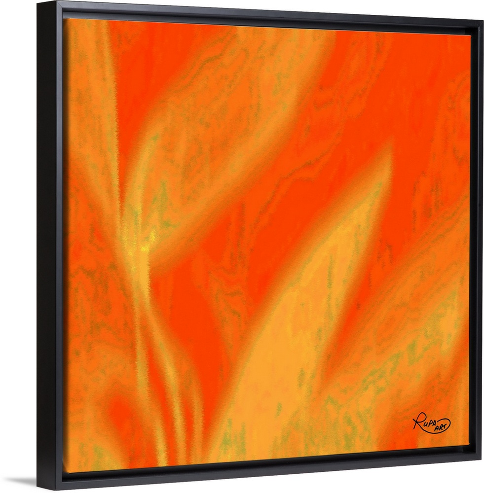 <p>Square abstract art with a bright orange background and large faded yellow designs.</p>