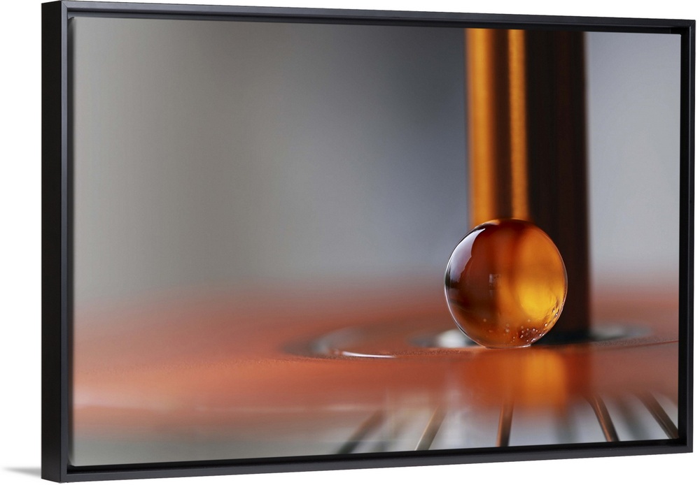 <p>A macro photograph of an orange water droplet against a abstract background.</p>