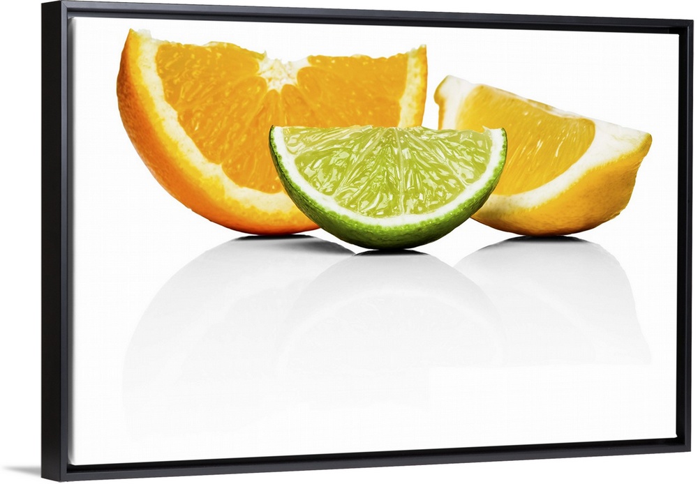 <p>Orange, lime and lemon wedges, on white background, cut out</p>