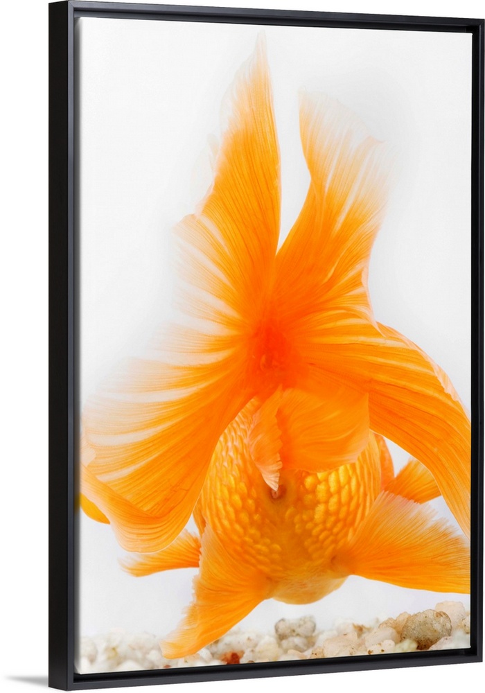 <p>Orange lionhead goldfish (Carassius auratus). Hooded variety of fancy goldfish. Back view. Studio shot against white background.</p>