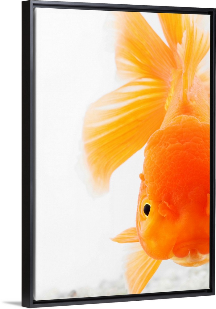 <p>Orange lionhead goldfish (Carassius auratus). Hooded variety of fancy goldfish. Close-up of face. Studio shot against white background.</p>