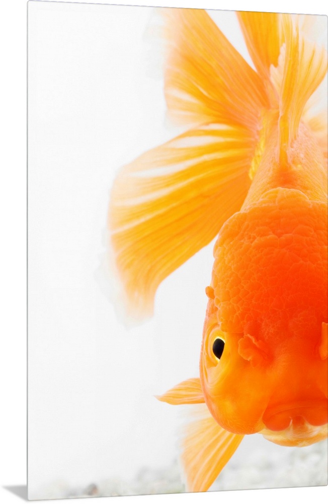 <p>Orange lionhead goldfish (Carassius auratus). Hooded variety of fancy goldfish. Close-up of face. Studio shot against white background.</p>