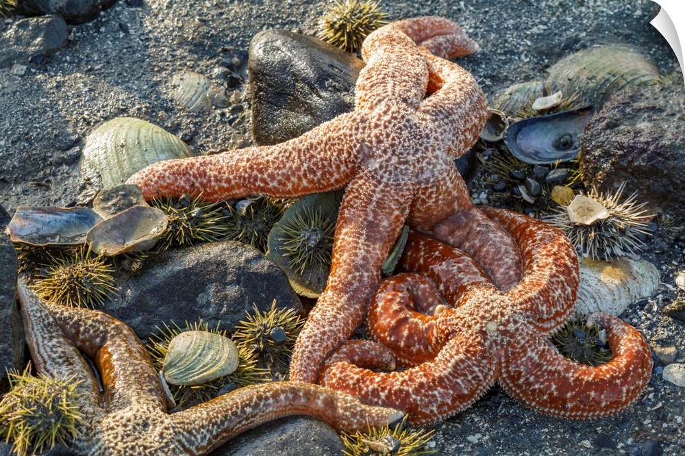 <p>USA, Alaska. Orange mottled sea stars and green sea urchins on the beach at low tide.</p>