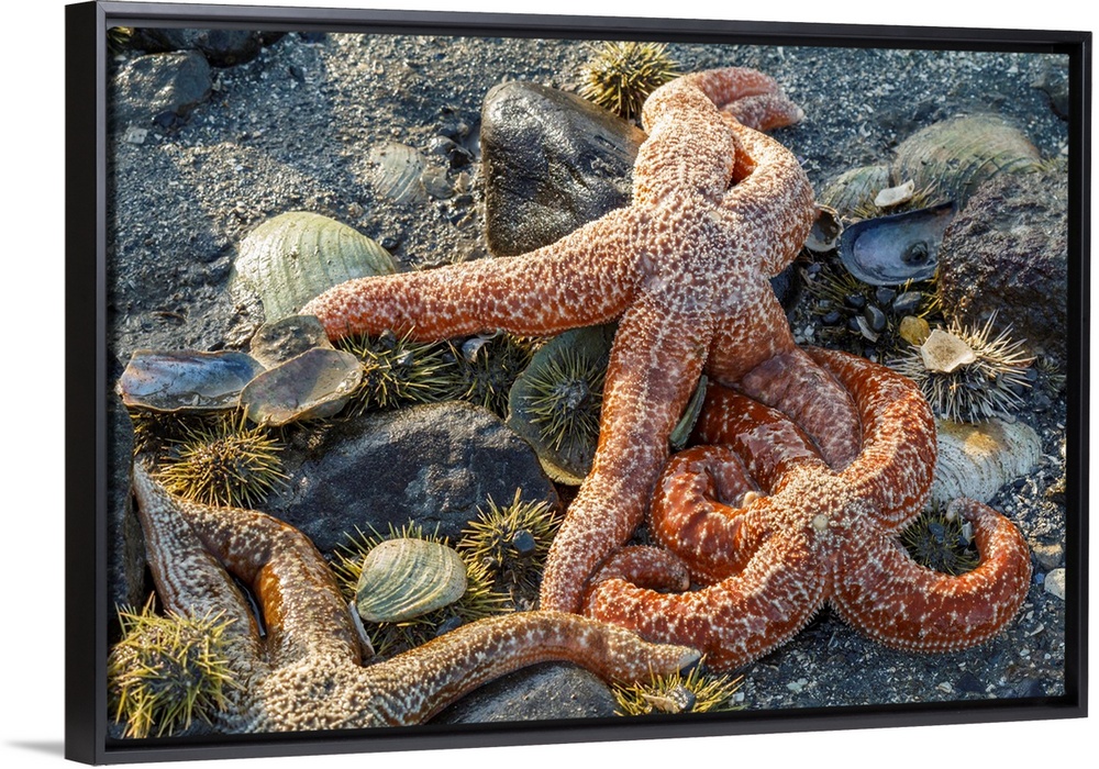 <p>USA, Alaska. Orange mottled sea stars and green sea urchins on the beach at low tide.</p>