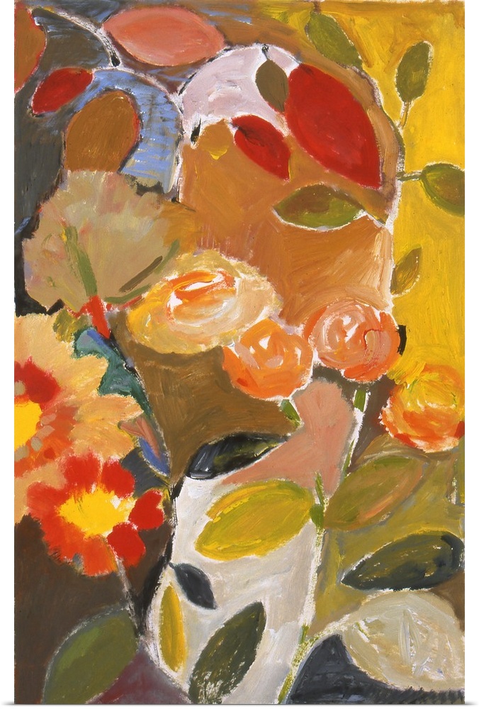 <p>Painting of large, softly-styled flowers in warm colors and green leaves against a brown background.</p>