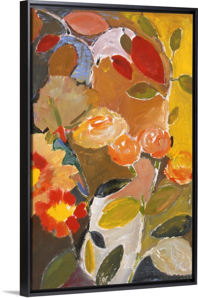 <p>Painting of large, softly-styled flowers in warm colors and green leaves against a brown background.</p>