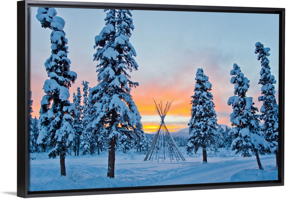 <p>Orange sky at sunset over snow-covered evergreens and a tee pee form.</p>