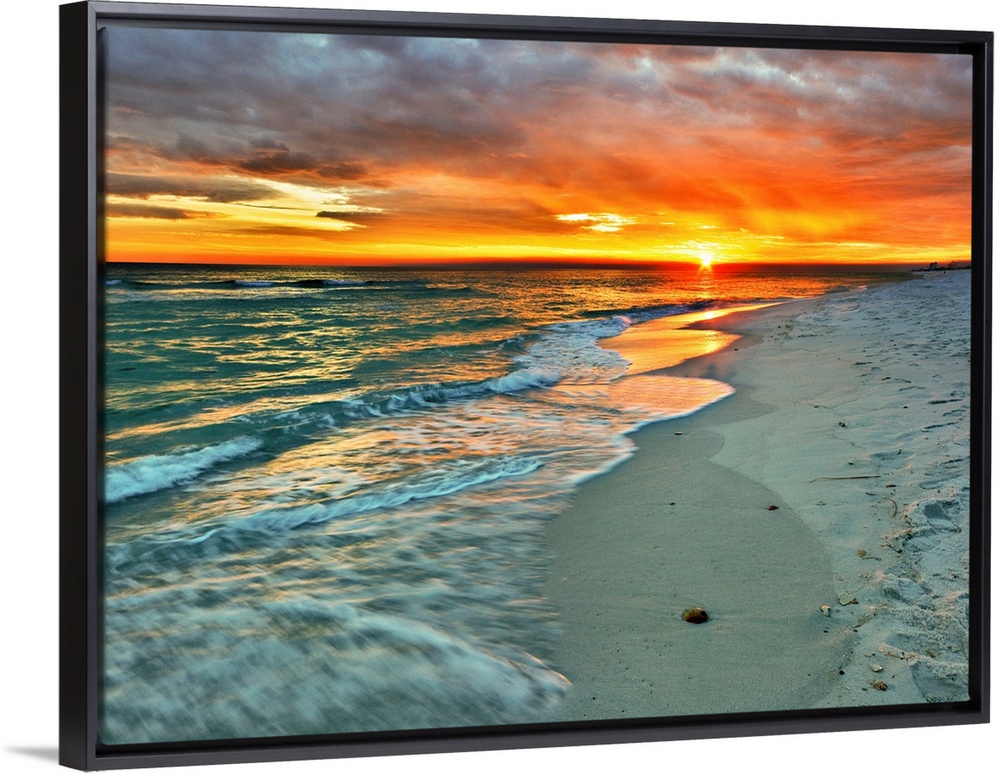 <p>Emerald waves flow over the shore in a soft white foam. Dark yellow and red sunset on the beach. Landscape taken on Navarre Beach, Florida.</p>