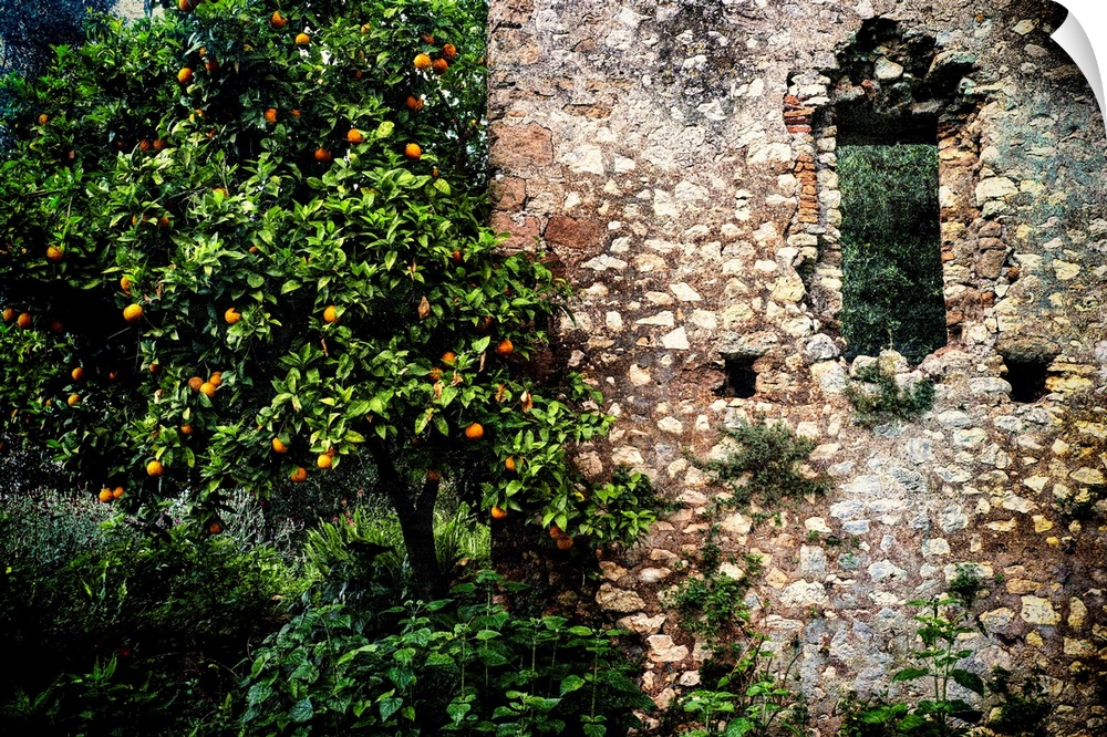 <p>Orange tree with citrus along a Ruined old building, Latina, Italy.</p>