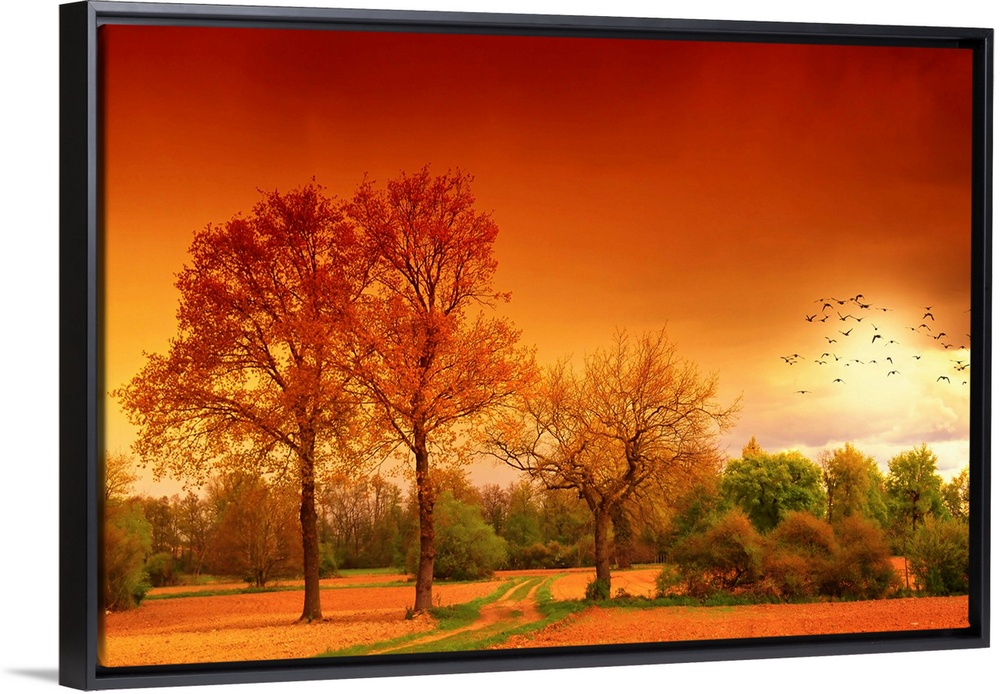 <p>This large lanscape piece shows a field with immense trees that have autumn colored leaves. Green trees can be seen in the backgound with birds grouped in the sky to the right of the picture.</p>