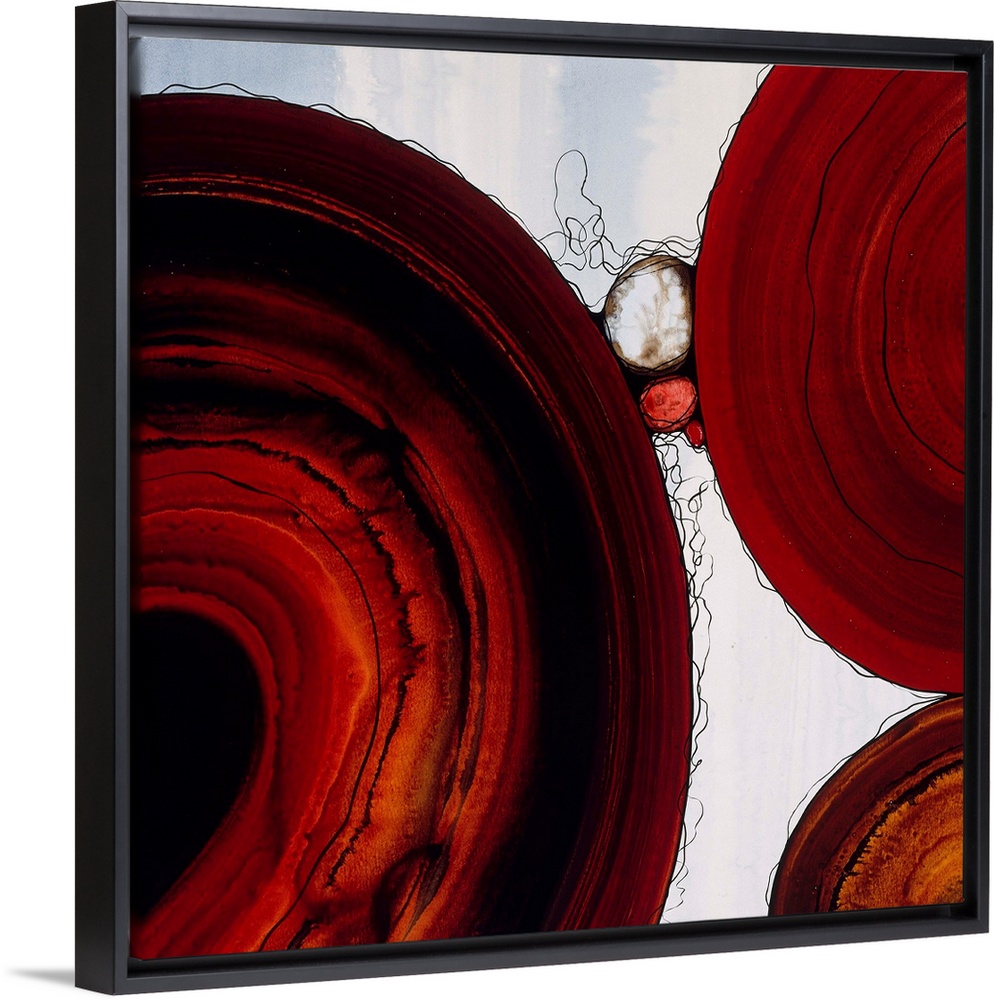 <p>Abstract painting with a geometric circle designs in red and orange tones on a faded blue and white background with small, thin, black squiggly lines on a square canvas.</p>