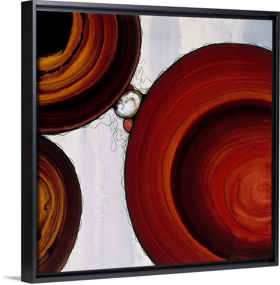 <p>Abstract painting with a geometric circle designs in red and orange tones on a faded blue and white background with small, thin, black squiggly lines on a square canvas.</p>