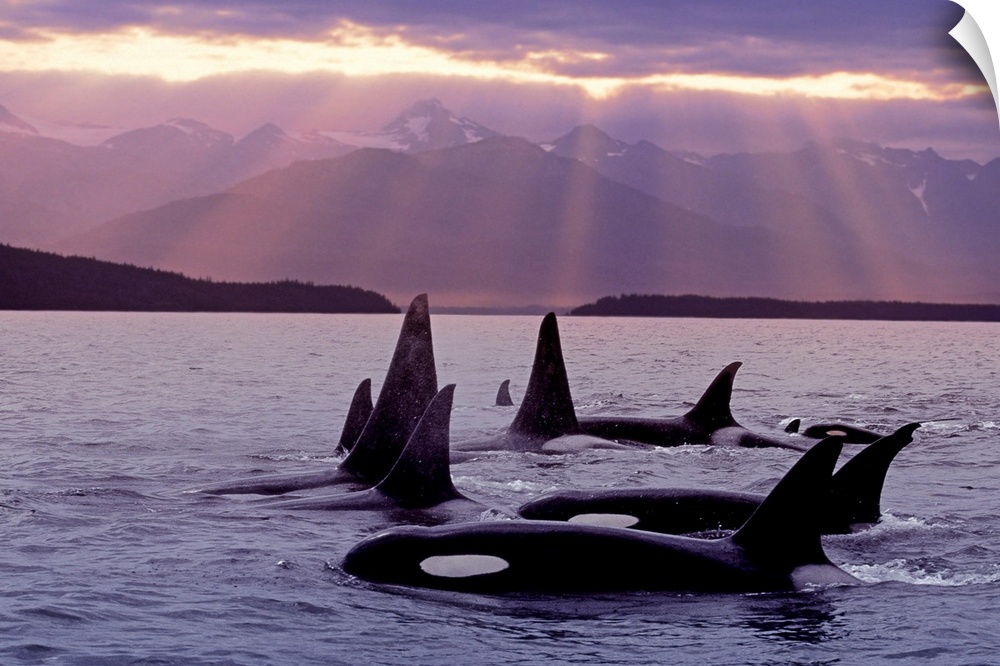 <p>Orca, Killer Whales, pod, Alaska, at surface, Lynn Canal, Sunset, Chilkat Mts., Inside Passage, Composite</p>