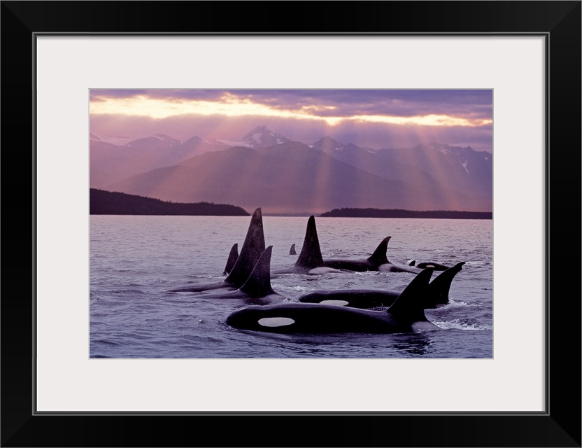<p>Orca, Killer Whales, pod, Alaska, at surface, Lynn Canal, Sunset, Chilkat Mts., Inside Passage, Composite</p>