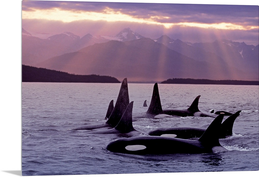 <p>Orca, Killer Whales, pod, Alaska, at surface, Lynn Canal, Sunset, Chilkat Mts., Inside Passage, Composite</p>