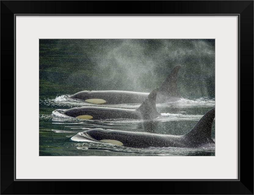 <p>Family group, killer whale calf, orca (Orcinus orca), Johnstone Strait near Robson Bight (Michael Biggs) Ecological Reserve, Vancouver Island, British Columbia, Canada</p>