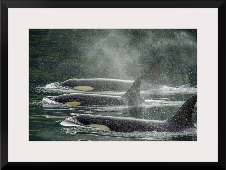<p>Family group, killer whale calf, orca (Orcinus orca), Johnstone Strait near Robson Bight (Michael Biggs) Ecological Reserve, Vancouver Island, British Columbia, Canada</p>