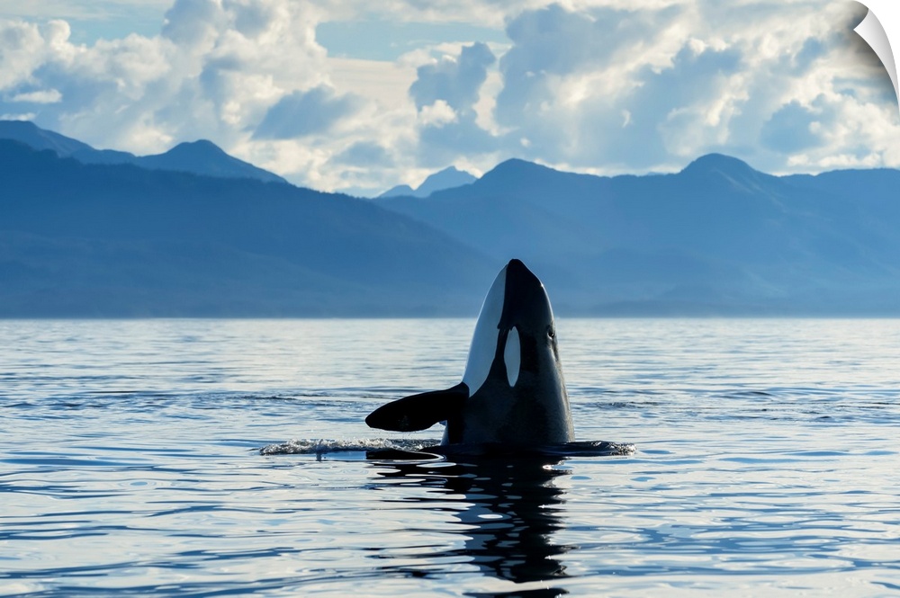 <p>An Orca (Orcinus orca), also known as a killer whale, spyhopping to get an above surface view of its surroundings, Chatham Strait, Inside Passage, Southeast Alaska; Alaska, United States of America.</p>