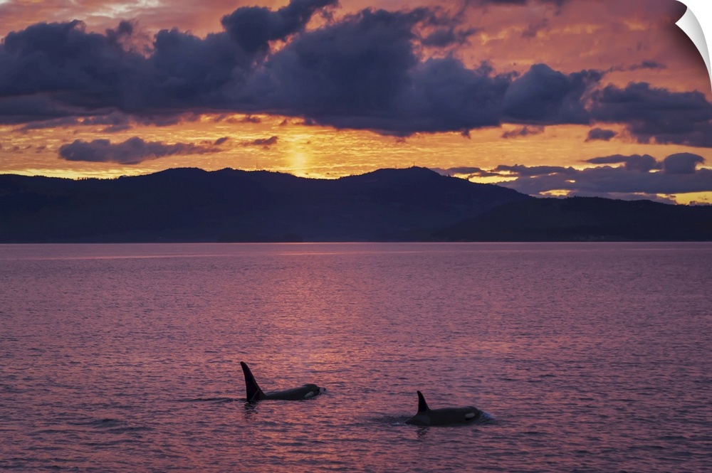 <p>Bigg's Killer whales or Orca (Orcinus orca) swim toward a colorful sunset in the San Juan Islands Washington, United States of America</p>