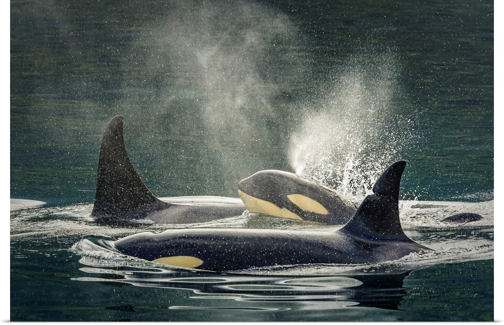 <p>Family group, killer whale calf, orca (Orcinus orca), Johnstone Strait near Robson Bight (Michael Biggs) Ecological Reserve Vancouver Island, British Columbia, Canada</p>