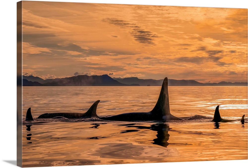 <p>Orca whale (Orcinus orca) pod in Chatham Strait at sunset, Southeast Alaska; Alaska, United States of America.</p>