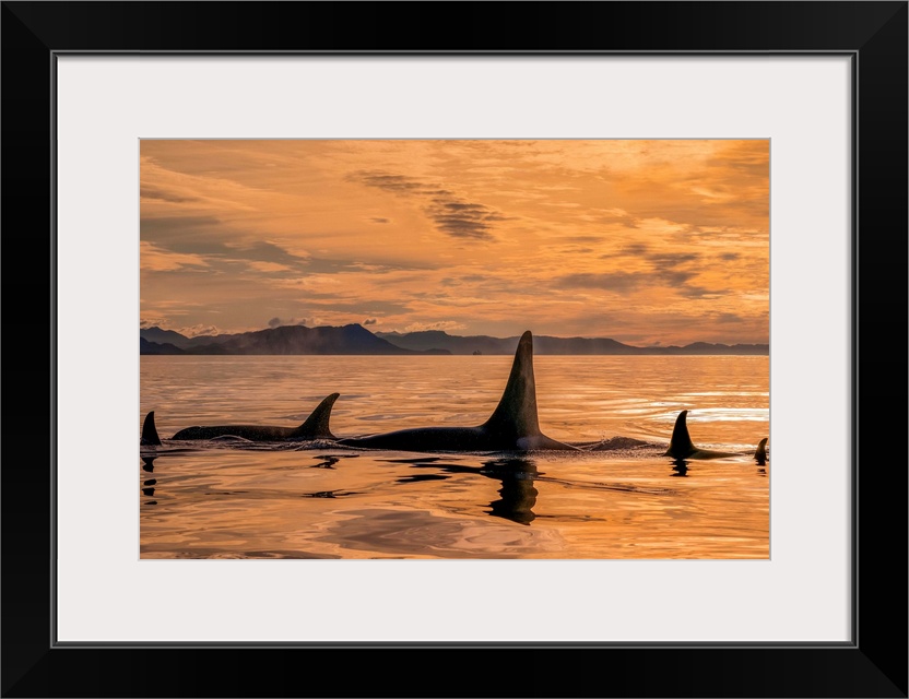 <p>Orca whale (Orcinus orca) pod in Chatham Strait at sunset, Southeast Alaska; Alaska, United States of America.</p>