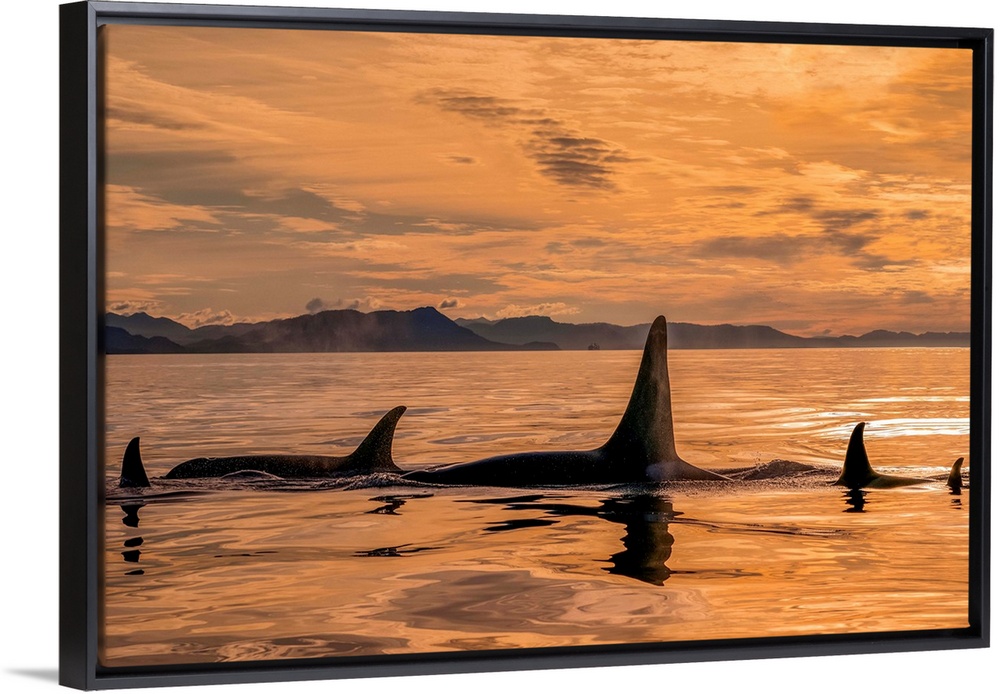<p>Orca whale (Orcinus orca) pod in Chatham Strait at sunset, Southeast Alaska; Alaska, United States of America.</p>
