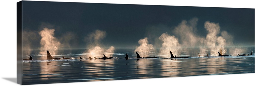 <p>A group of Orca (killer) whales come to the surface on a calm day in Lynn Canal, Alaska, near Juneau.</p>