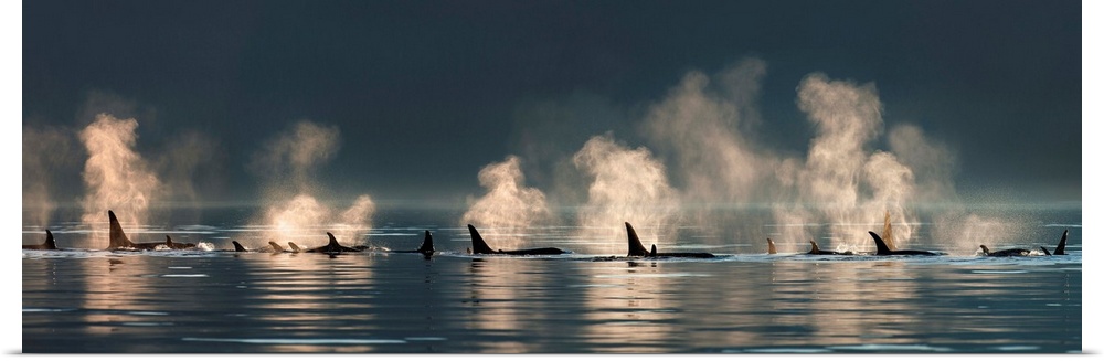 <p>A group of Orca (killer) whales come to the surface on a calm day in Lynn Canal, Alaska, near Juneau.</p>