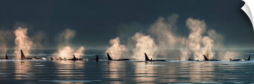 <p>A group of Orca (killer) whales come to the surface on a calm day in Lynn Canal, Alaska, near Juneau.</p>