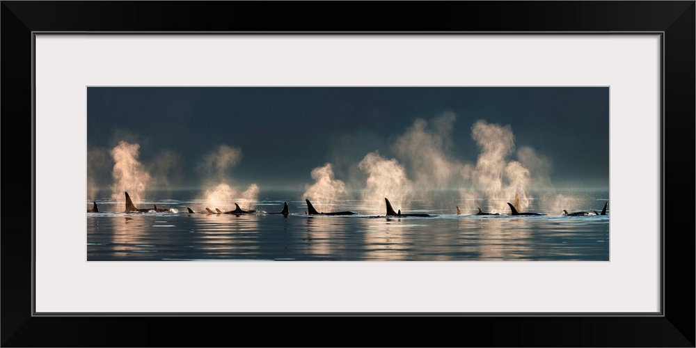 <p>A group of Orca (killer) whales come to the surface on a calm day in Lynn Canal, Alaska, near Juneau.</p>
