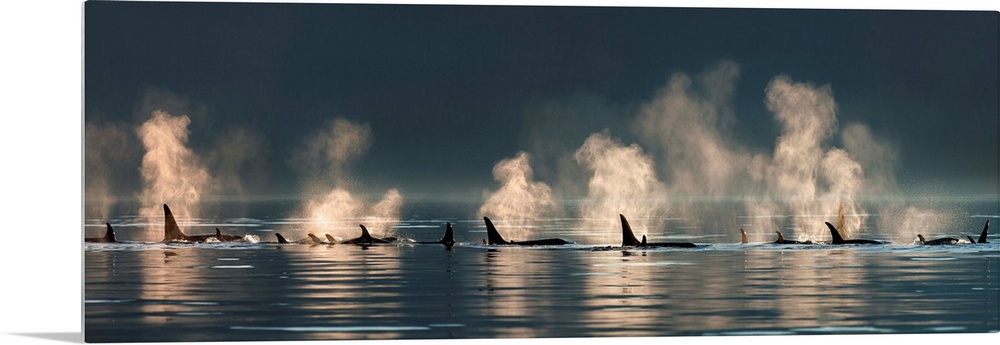 <p>A group of Orca (killer) whales come to the surface on a calm day in Lynn Canal, Alaska, near Juneau.</p>