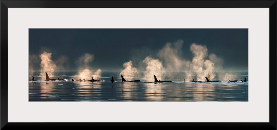 <p>A group of Orca (killer) whales come to the surface on a calm day in Lynn Canal, Alaska, near Juneau.</p>