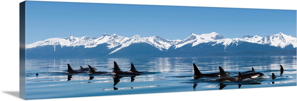 <p>A group of Orca (killer) whales come to the surface on a calm day in Lynn Canal, Alaska, near Juneau.</p>