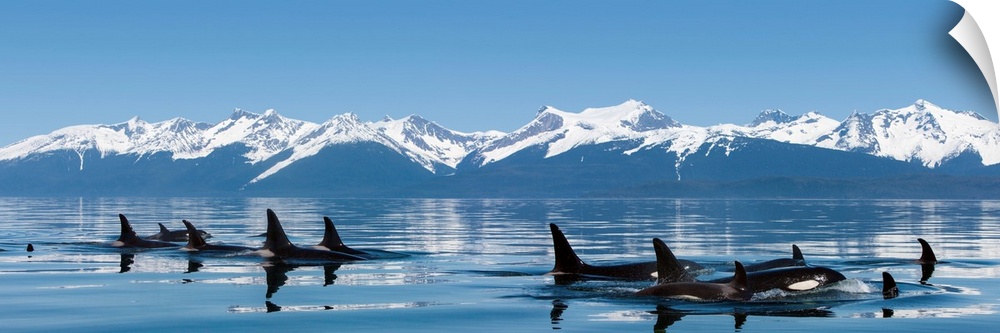 <p>A group of Orca (killer) whales come to the surface on a calm day in Lynn Canal, Alaska, near Juneau.</p>