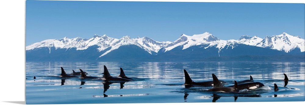 <p>A group of Orca (killer) whales come to the surface on a calm day in Lynn Canal, Alaska, near Juneau.</p>