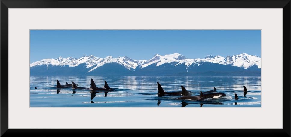 <p>A group of Orca (killer) whales come to the surface on a calm day in Lynn Canal, Alaska, near Juneau.</p>