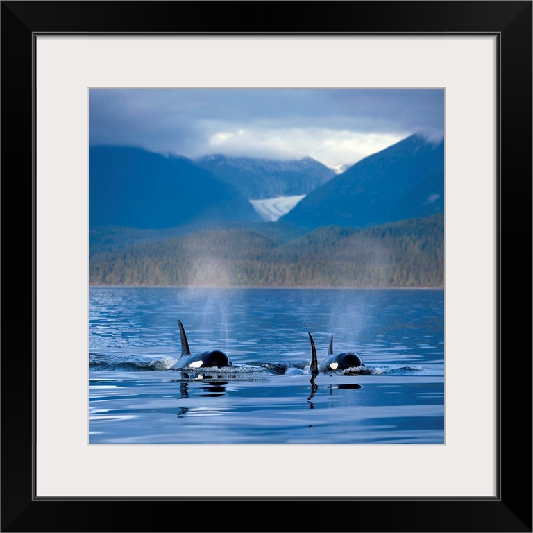 <p>Orca Whales surface in Alaska's Inside passage with the Coastal Range and Eagle Glacier in the background, Southeast Alaska</p>