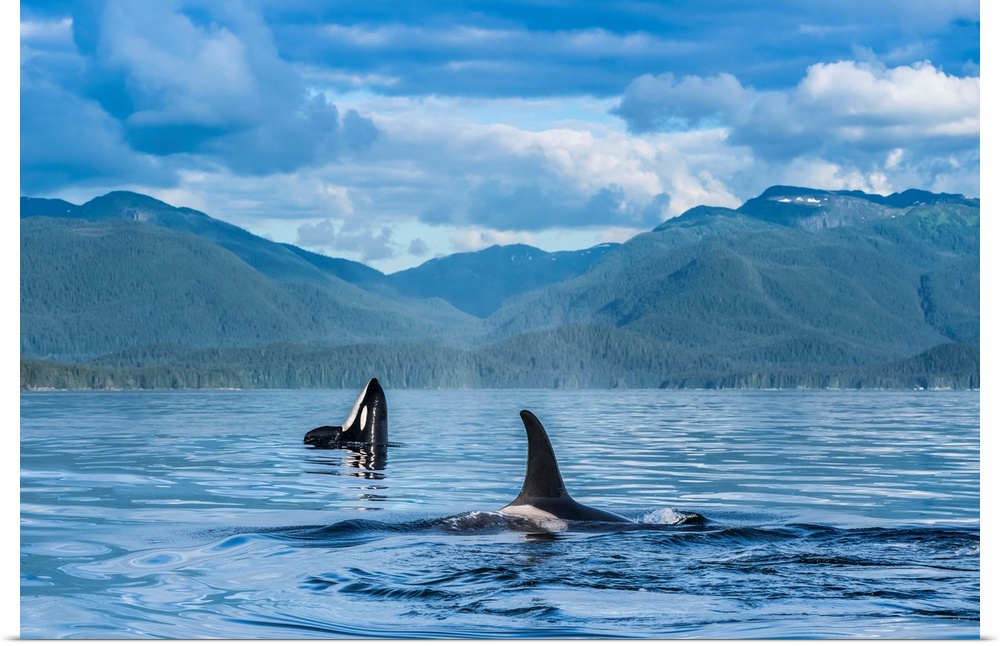 <p>Orcas (Orcinus orca), also known as a Killer Whales, surface in Chatham Strait, spy hop in background, Inside Passage; Alaska, United States of America.</p>