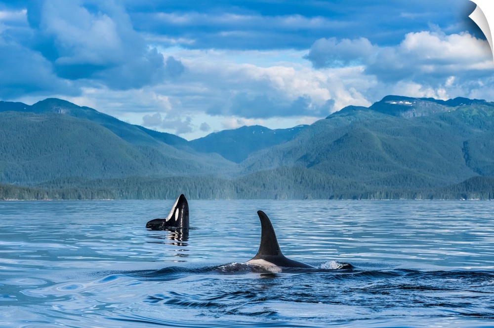 <p>Orcas (Orcinus orca), also known as a Killer Whales, surface in Chatham Strait, spy hop in background, Inside Passage; Alaska, United States of America.</p>