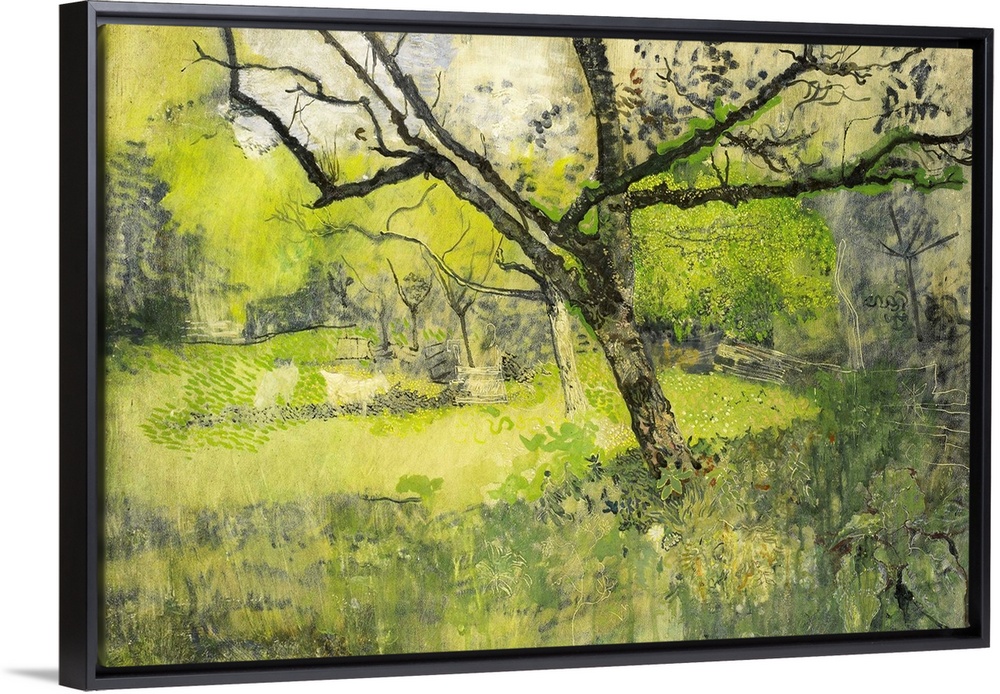 <p>Orchard at Eemnes, by Richard Roland Holst, 1888-95, Dutch painting, oil on canvas. Stylized depiction of fruit trees in a meadow in which the artist has drawn by scraping through the paint surface with a sharp stylus.</p>