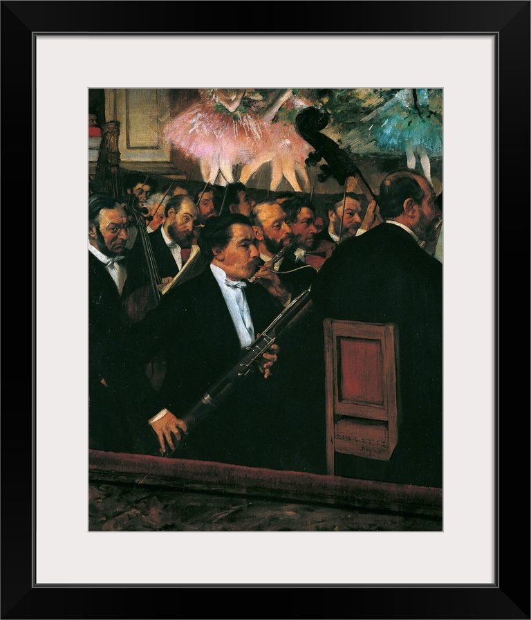 <p>The Orchestra at the Opera House, by Edgar Degas, 1868 - 1869, 19th Century, oil on canvas, cm 56,5 x 46 - France, Ile de France, Paris, Muse dOrsay, RF 2210. All. Orchestra Opera House bassoon flute violin viola cello double bass dancers stage pink azure</p>