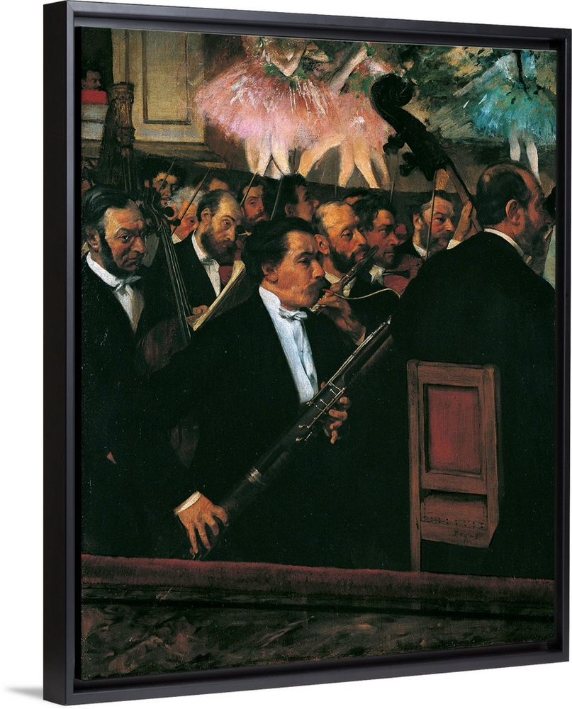 <p>The Orchestra at the Opera House, by Edgar Degas, 1868 - 1869, 19th Century, oil on canvas, cm 56,5 x 46 - France, Ile de France, Paris, Muse dOrsay, RF 2210. All. Orchestra Opera House bassoon flute violin viola cello double bass dancers stage pink azure</p>