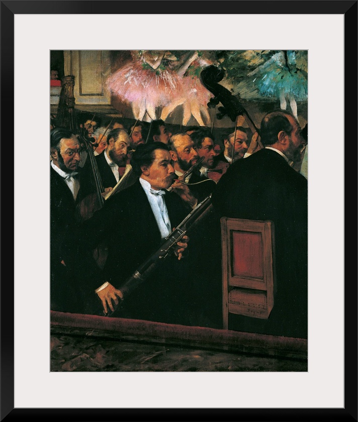 <p>The Orchestra at the Opera House, by Edgar Degas, 1868 - 1869, 19th Century, oil on canvas, cm 56,5 x 46 - France, Ile de France, Paris, Muse dOrsay, RF 2210. All. Orchestra Opera House bassoon flute violin viola cello double bass dancers stage pink azure</p>