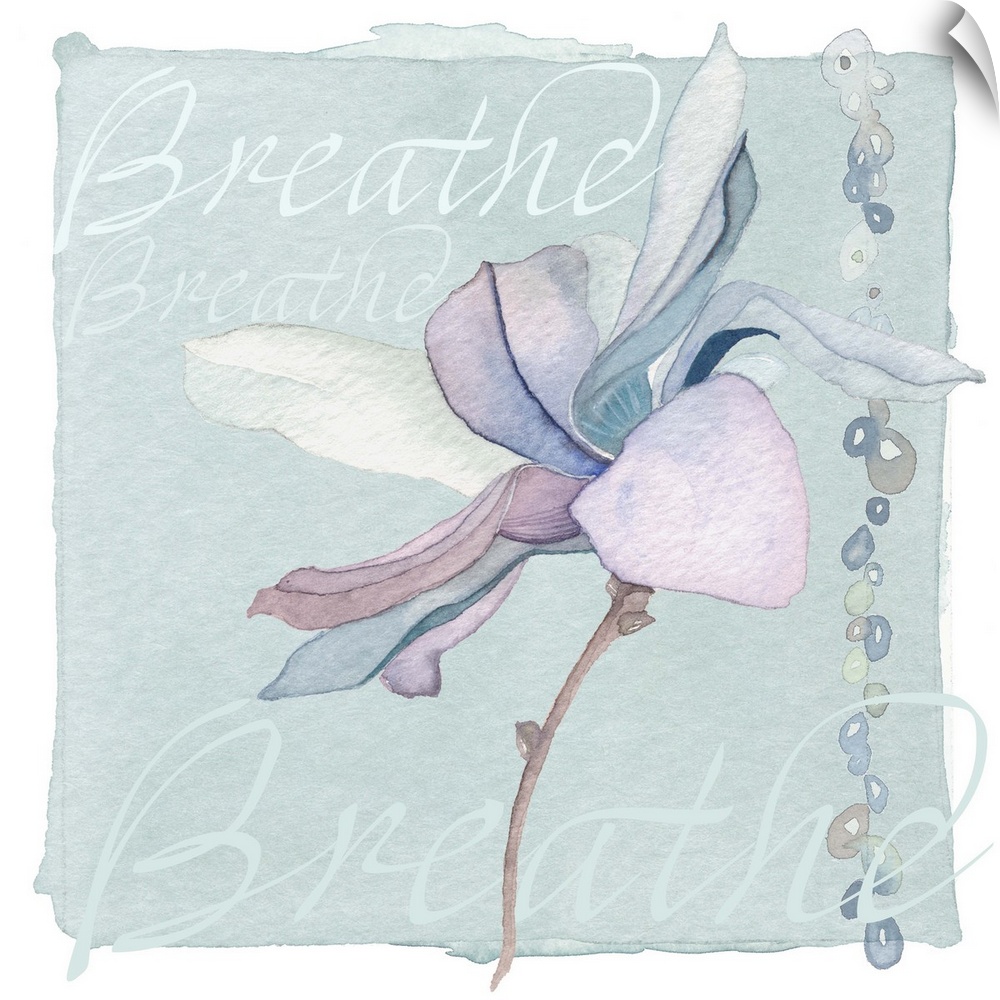 <p>Decorative watercolor painting of a purple lily with the word "Breathe" repeated in the background.</p>