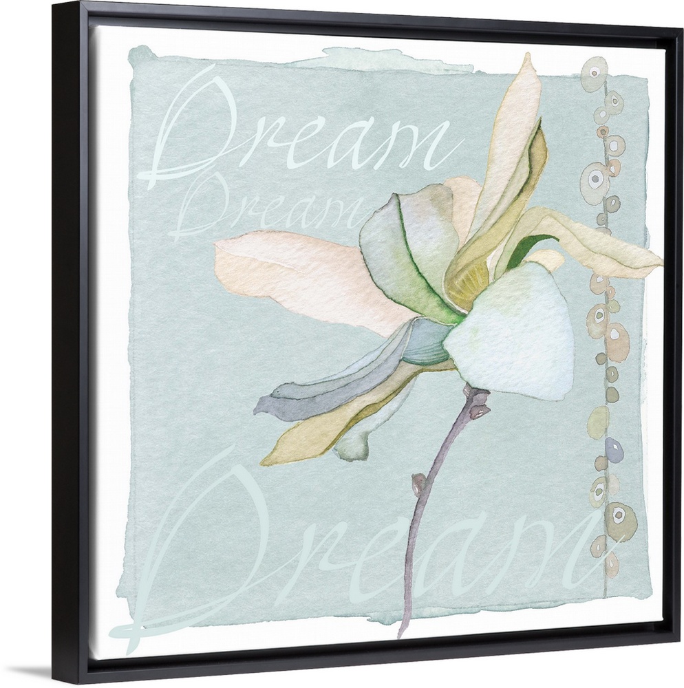 <p>Decorative watercolor painting of a green lily with the word "Dream" repeated in the background.</p>