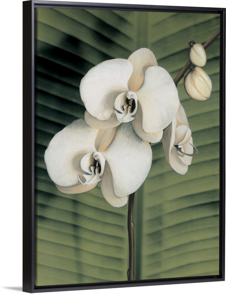 <p>Contemporary painting of three white orchids with a palm leaf background.</p>