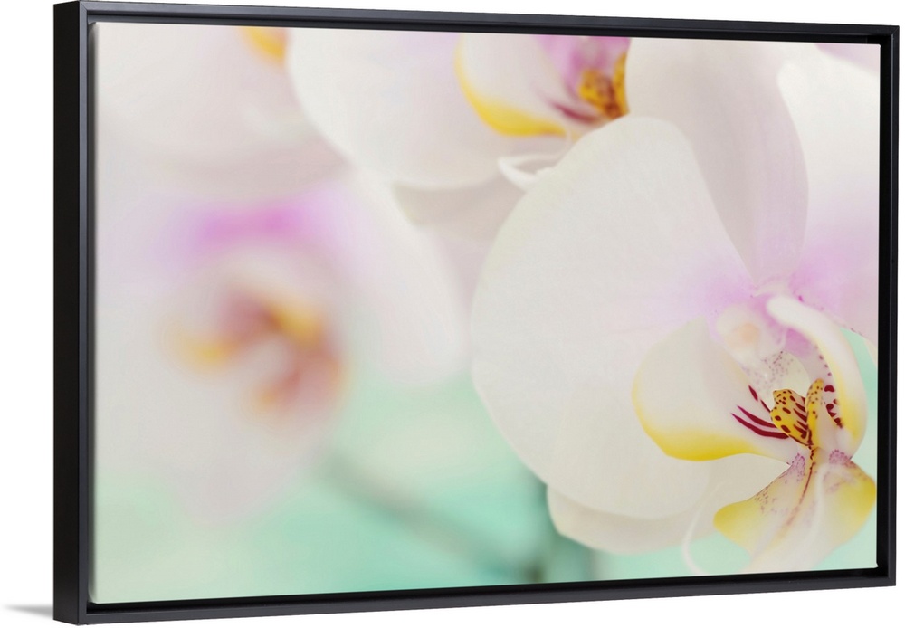 <p>Landscape, oversized, close up photograph of several fully bloomed orchids, the one in the foreground in focus, those is the background are slightly out of focus.</p>