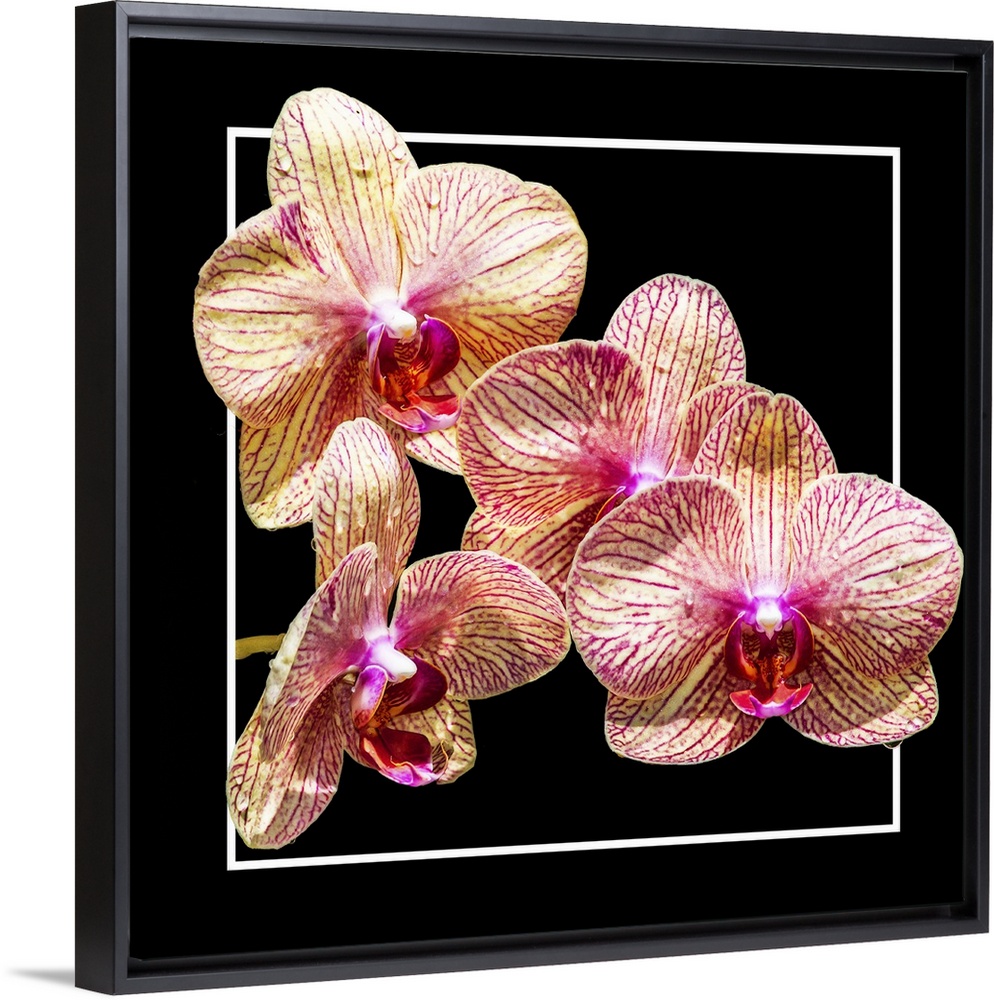 <p>Close up of peach-colored orchid flowers in a white and black frame.</p>