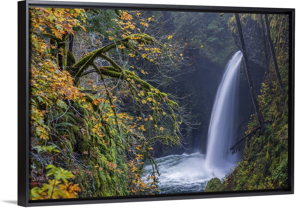 <p>USA, Oregon. Autumn fall color and mist at Metlako Falls on Eagle Creek in the Columbia Gorge.</p>